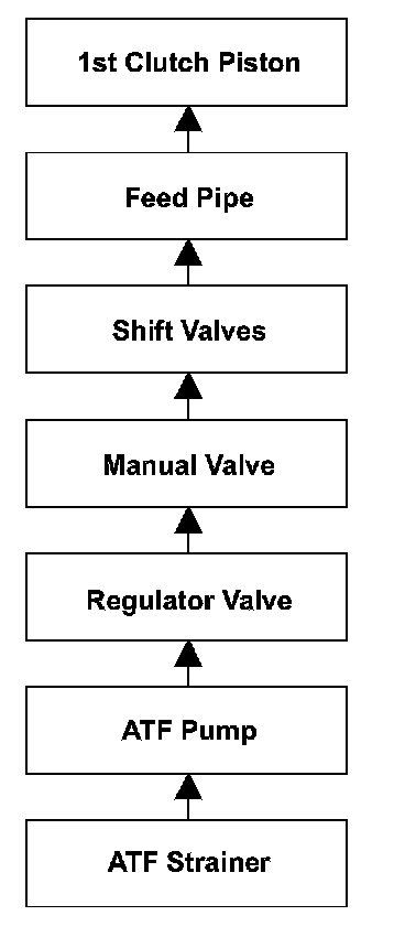 To engage 1st gear, line pressure is supplied to the 1st clutch piston, engaging the 1st clutch, and the secondary shaft and the secondary shaft 1st gear are connected and revolve together. Hydraulic pressure is supplied to the 1st clutch through the ATF strainer --> the ATF pump --> the regulator valve --> the manual valve --> the shift valves --> the feed pipe --> the 1st clutch piston. (A shift valve failure in the supply route above is detected by the malfunction detection of each shift solenoid valve.) The powertrain control module (PCM) computes the ratio of the input shaft (mainshaft) speed to the output shaft (countershaft) speed. When the ratio is not the 1st gear ratio, the PCM detects a malfunction of the hydraulic circuit or the 1st clutch and stores a DTC.