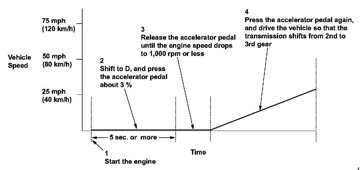 2. Shift to D, and press the accelerator pedal about 3 % for at least 5 seconds.