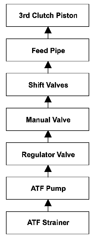 To engage 3rd gear, line pressure is supplied to the 3rd clutch piston, engaging the 3rd clutch, and the intermediary shaft and the intermediary shaft 3rd gear are connected and revolve together. Hydraulic pressure is supplied to the 3rd clutch through the ATF strainer --> the ATF pump --> the regulator valve --> the manual valve --> the shift valves --> the feed pipe --> the 3rd clutch piston. (A shift valve failure in the supply route above is detected by the malfunction detection of each shift solenoid valve.) The powertrain control module (PCM) computes the ratio of the input shaft (mainshaft) speed to the output shaft (countershaft) speed. When the ratio is not the 3rd gear ratio, the PCM detects a malfunction of the hydraulic circuit or the 3rd clutch and stores a DTC.