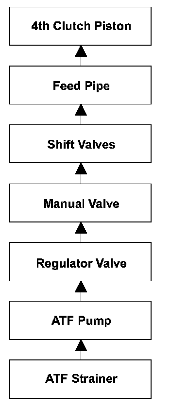 To engage 4th gear, line pressure is supplied to the 4th clutch piston, engaging the 4th clutch, and the mainshaft and the mainshaft 4th gear are connected and revolve together. Hydraulic pressure is supplied to the 4th clutch through the ATF strainer --> the ATF pump --> the regulator valve --> the manual valve --> the shift valves --> the feed pipe --> the 4th clutch piston. (A shift valve failure in the supply route above is detected by the malfunction detection of each shift solenoid valve.) The powertrain control module (PCM) computes the ratio of the input shaft (mainshaft) speed to the output shaft (countershaft) speed. When the ratio is not the 4th gear ratio, the PCM detects a malfunction of the hydraulic circuit or the 4th clutch and stores a DTC.