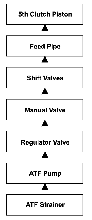 To engage 5th gear, line pressure is supplied to the 5th clutch piston, engaging the 5th clutch, and the mainshaft and the mainshaft 5th gear are connected and revolve together. Hydraulic pressure is supplied to the 5th clutch through the ATF strainer --> the ATF pump --> the regulator valve --> the manual valve --> the shift valves --> the feed pipe --> the 5th clutch piston. (A shift valve failure in the supply route above is detected by the malfunction detection of each shift solenoid valve.) The powertrain control module (PCM) computes the ratio of the input shaft (mainshaft) speed to the output shaft (countershaft) speed. When the ratio is not the 5th gear ratio, the PCM detects a malfunction of the hydraulic circuit or the 5th clutch and stores a DTC.