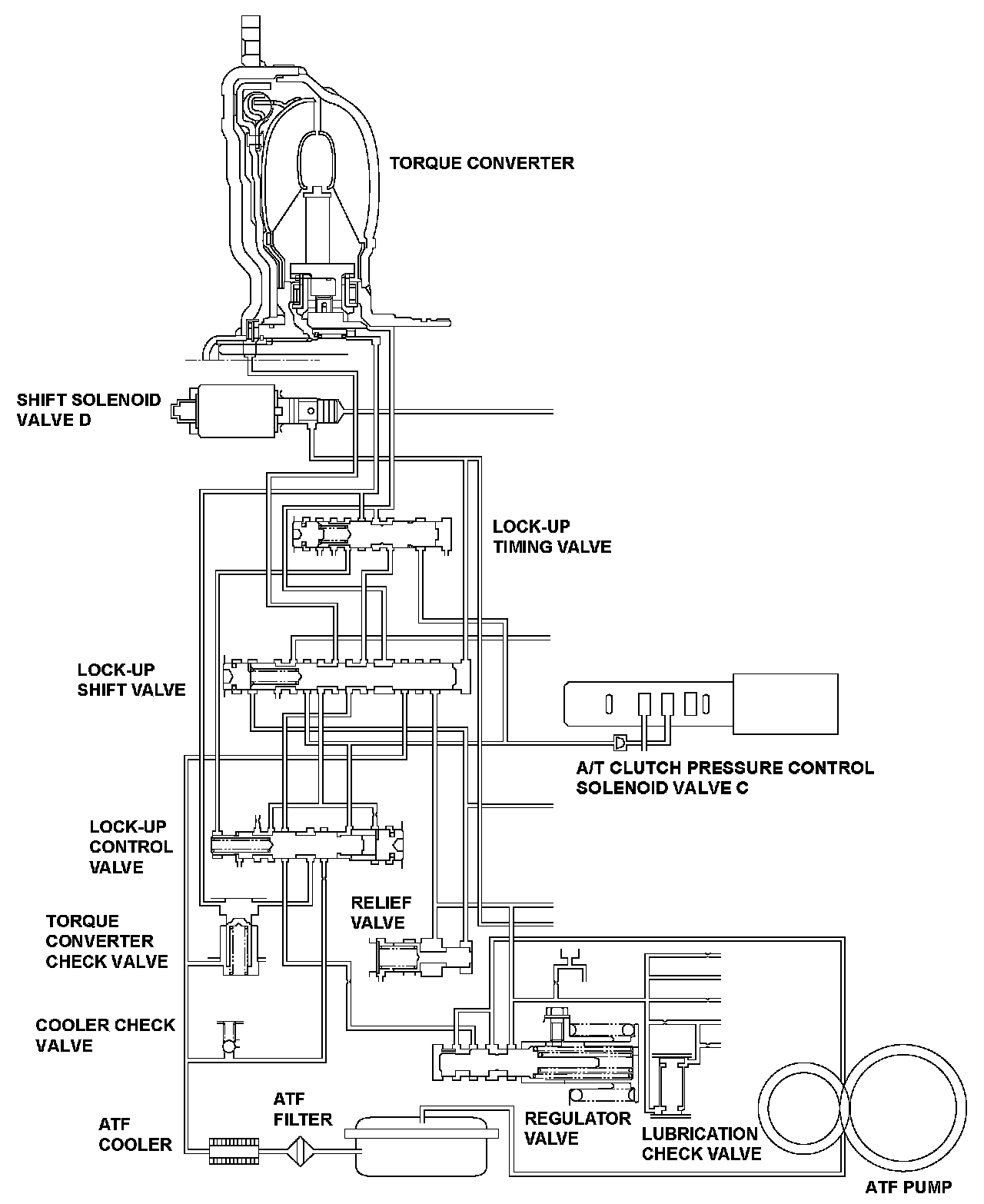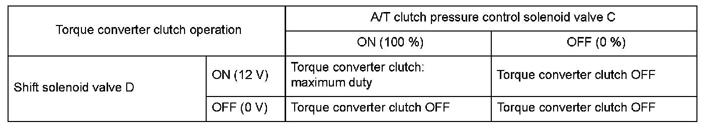 The power transfer capacity of the torque converter clutch is controlled by the balance of automatic transmission fluid (ATF) supply to and discharge from the torque converter. When hydraulic pressure is applied internally, the torque converter clutch turns ON, and when hydraulic pressure is applied from the back pressure side, the torque converter clutch turns OFF. As the hydraulic pressure from the internal pressure side increases, the power transfer capacity of the torque converter clutch increases. The direction of hydraulic pressure supply is switched by shift solenoid valve D and the lock-up shift valve. ATF is supplied from the internal pressure side to shift solenoid valve D when the signal from the powertrain control module (PCM) is ON (12 V), and ATF is supplied from the back pressure side when it is OFF (0 V). The balance of internal pressure and back pressure is controlled by A/T clutch pressure control solenoid valve C, the lock-up control valve, and the lock-up timing valve. A/T clutch pressure control solenoid valve C maximizes the power transfer capacity of the torque converter clutch when the signal from the PCM is ON (1 A), and it minimizes the power transfer capacity of the torque converter clutch when the signal from the PCM is OFF (0 A). If the ratio of engine speed and input shaft (mainshaft) speed is not about 1:1 while the PCM is issuing the command to turn shift solenoid valve D and A/T clutch pressure control solenoid valve C ON, the PCM detects a faulty lock-up control system and stores a DTC.