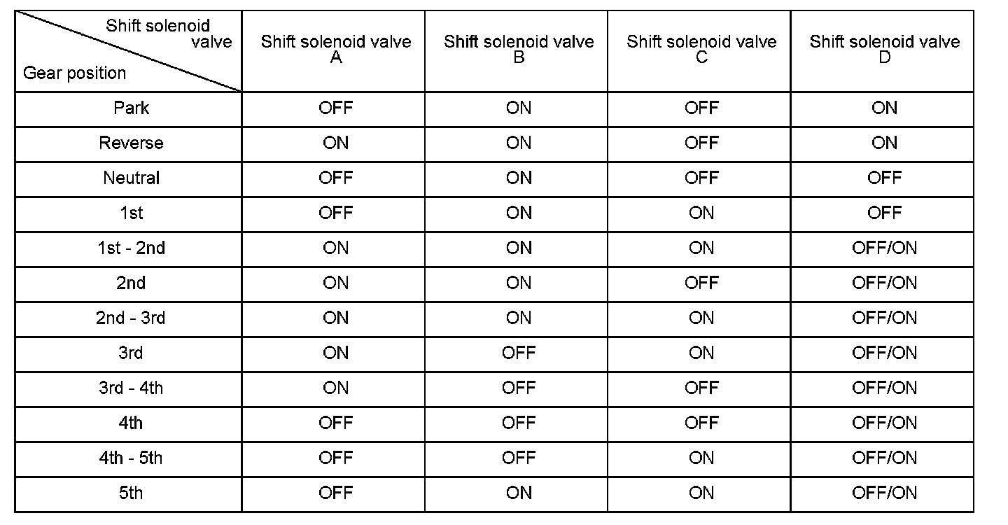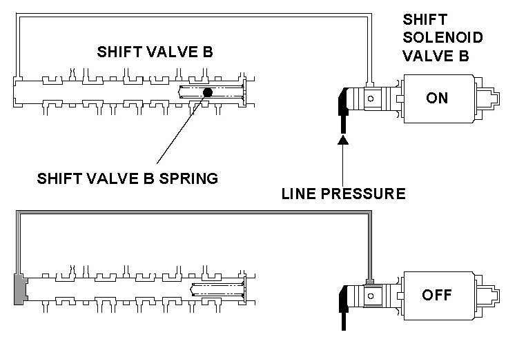 Shift solenoid valve B is installed in the transmission housing. It is controlled by the ON/OFF signal from the powertrain control module (PCM) to apply modulated pressure to shift valve B. The signal from the PCM is output to apply clutch pressure control pressure to the proper gear clutch according to the gear change schedule. When the signal to shift solenoid valve B from the PCM is ON, and modulated pressure is discharged, shift valve B is inactive. When the signal to shift solenoid valve B from the PCM is OFF, and modulated pressure is applied to shift valve B, it operates against the shift valve B spring. The PCM monitors the input shaft (mainshaft) speed and the output shaft (countershaft) speed at the gear change determined by the shift schedule. When an improper gear ratio is output compared to the predetermined gear change mode, the PCM detects a shift solenoid valve B ON failure and stores a DTC.