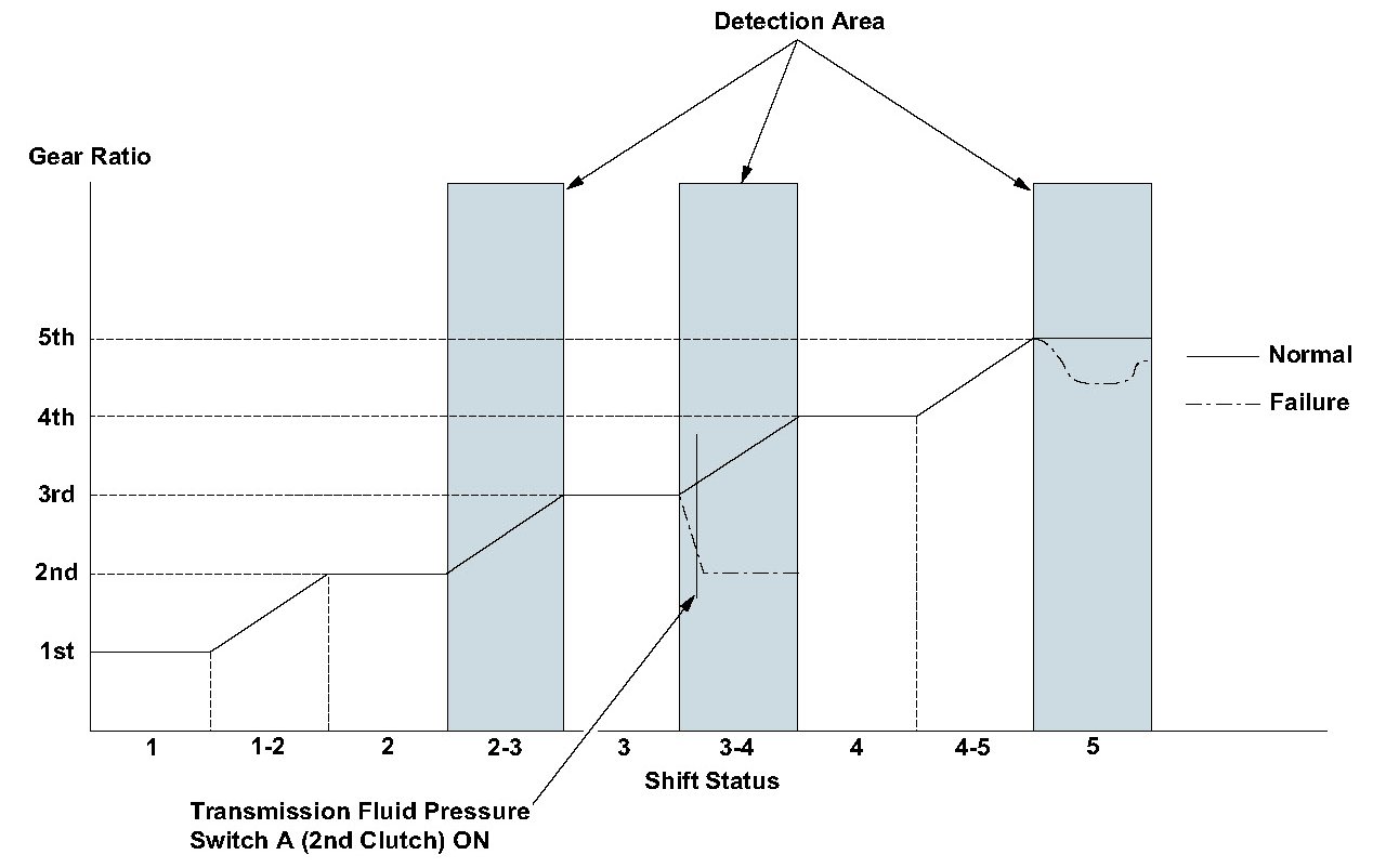- Symptom 1: Transmission fluid pressure switch A (2nd clutch) is ON against the 3rd --> 4th gear upshift command for at least 11 seconds.