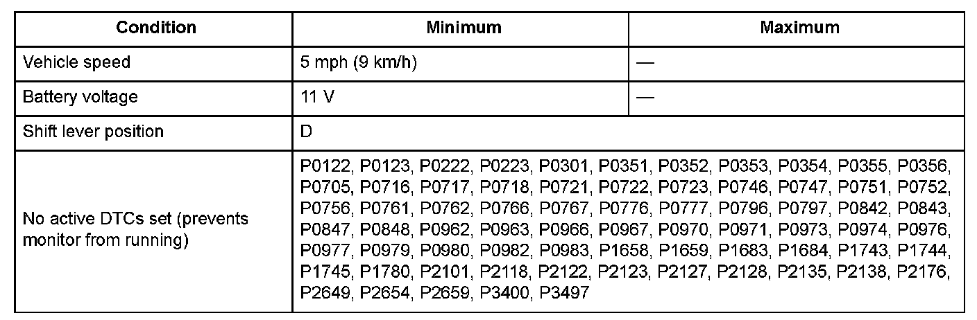 Conditions for setting the DTC