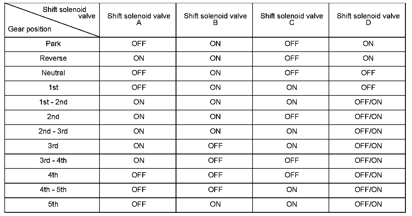 Shift solenoid valve D is installed in the transmission housing. It is controlled by the ON/OFF signal from the powertrain control module (PCM) to apply modulated pressure to the lock-up shift valve. The signal from the PCM is output to apply clutch pressure control pressure to the proper gear clutch according to the gear change schedule. When the signal to shift solenoid valve D from the PCM is ON, and modulated pressure is applied to the lock-up shift valve, it operates against the lock-up shift valve spring. When the signal to shift solenoid valve D from the PCM is OFF, and modulated pressure is discharged, the lock-up shift valve is inactive. The PCM monitors the input shaft (mainshaft) speed and the output shaft countershaft) speed at the gear change determined by the shift schedule. When an improper gear ratio is output compared to the predetermined gear change mode, the PCM detects a shift solenoid valve D ON failure and stores a DTC.