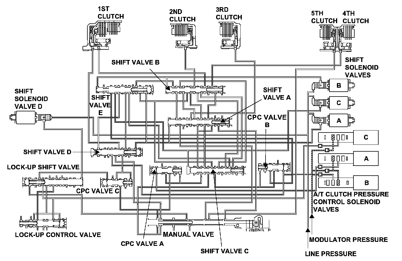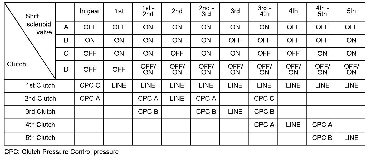 A/T clutch pressure control solenoid valve C is installed in the transmission housing. A/T clutch pressure control solenoid valve C is operated by the powertrain control module (PCM) and converts the modulated pressure to A/T clutch pressure control solenoid valve C pressure, which operates CPC valve C. Line pressure is modulated to clutch pressure control C pressure (CPC C pressure) by CPC valve C and the CPC valve C spring. A signal from the PCM is output to the proper gear clutch, determined by the gear schedule, to supply the proper CPC pressure according to the driving conditions. When the current from the PCM is high (ON), A/T clutch pressure control solenoid valve C operates and the CPC valve C pressure increases. When the current from the PCM is low (OFF), A/T clutch pressure control solenoid valve C turns off and CPC valve C pressure decreases. The PCM monitors the input shaft (mainshaft) speed and the output shaft (countershaft) speed at the gear change determined by the shift schedule. When an improper gear ratio is output compared to the predetermined gear ratio, the PCM detects an A/T clutch pressure control solenoid valve C OFF failure and stores a DTC.