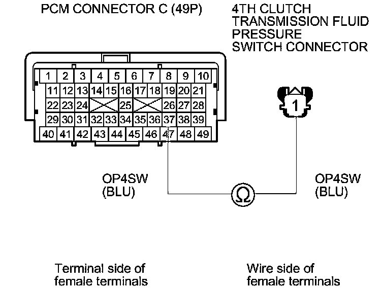 19. Check for continuity between PCM connector terminal C37 and the 4th clutch transmission fluid pressure switch connector terminal.