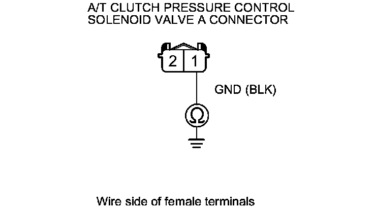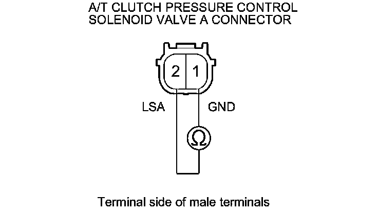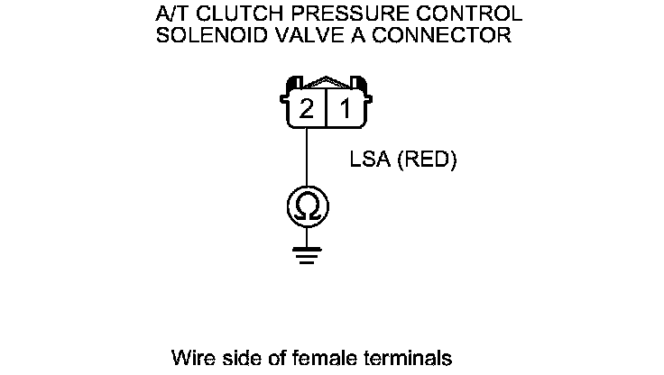 10. Measure the resistance between A/T clutch pressure control solenoid valve A connector terminals No. 1 and No. 2.