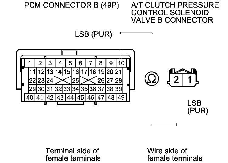 14. Check for continuity between PCM connector terminal B10 and A/T clutch pressure control solenoid valve B connector terminal No. 2.