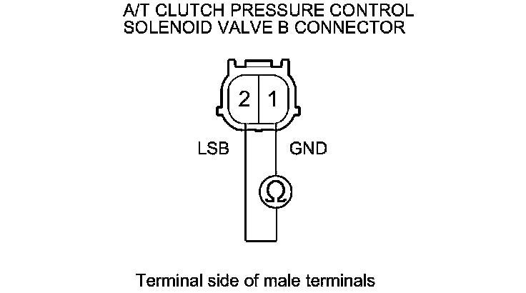 10. Measure the resistance between A/T clutch pressure control solenoid valve B connector terminals No. 1 and No. 2.