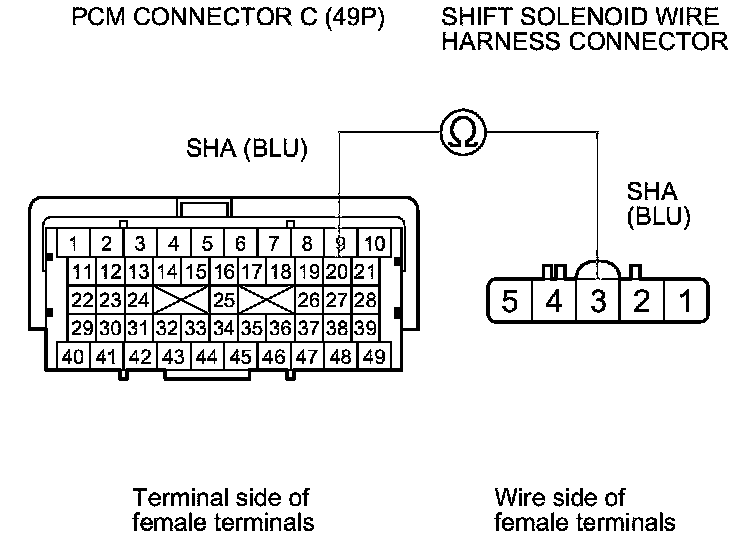 13. Check for continuity between PCM connector terminal C20 and shift solenoid wire harness connector terminal No. 3.