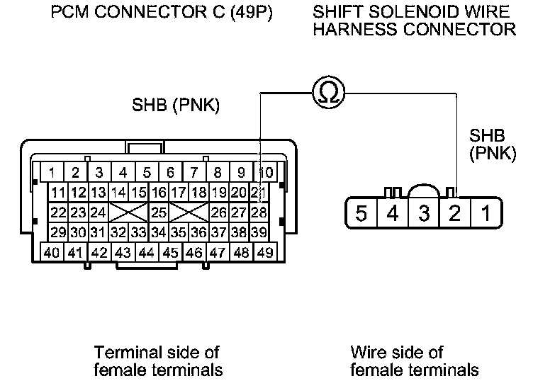13. Check for continuity between PCM connector terminal C28 and shift solenoid wire harness connector terminal No. 2.