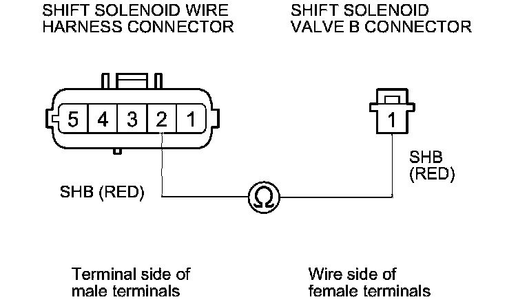 15. Check for continuity between shift solenoid wire harness connector terminal No. 2 and the shift solenoid valve B connector terminal.
