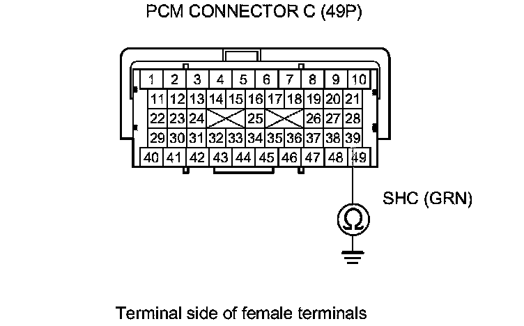 13. Check for continuity between PCM connector terminal C39 and body ground.