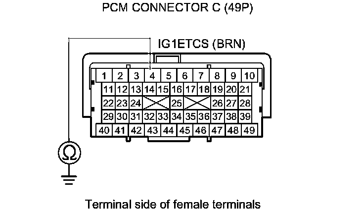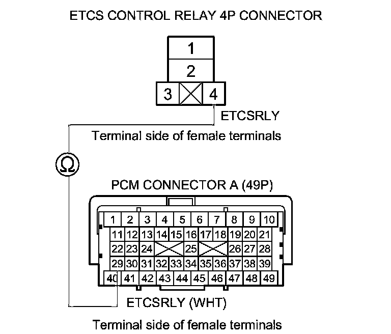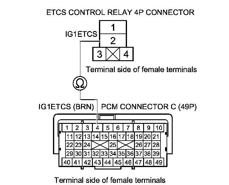 14. Check for continuity between ETCS control relay 4P connector terminal No. 2 and PCM connector terminal C4.