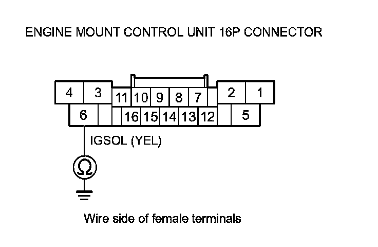 8. Check for continuity between engine mount control unit 16P connector terminal No. 6 and body ground.