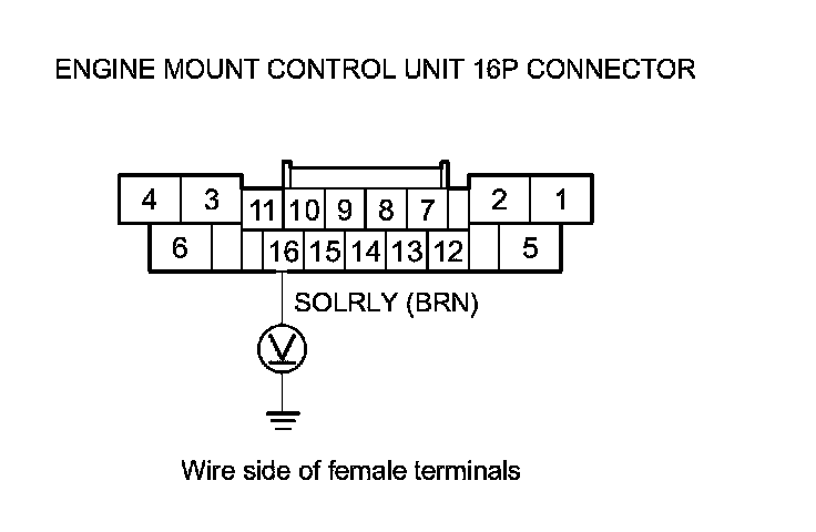 12. Measure the voltage between engine mount control unit 16P connector terminal No. 16 and body ground.