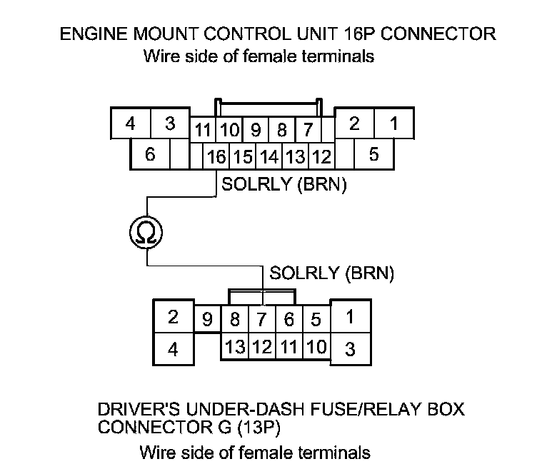 15. Check for continuity between engine mount control unit 16P connector terminal No. 16 and driver's under-dash fuse/relay box connector G (13P) terminal No. 7.