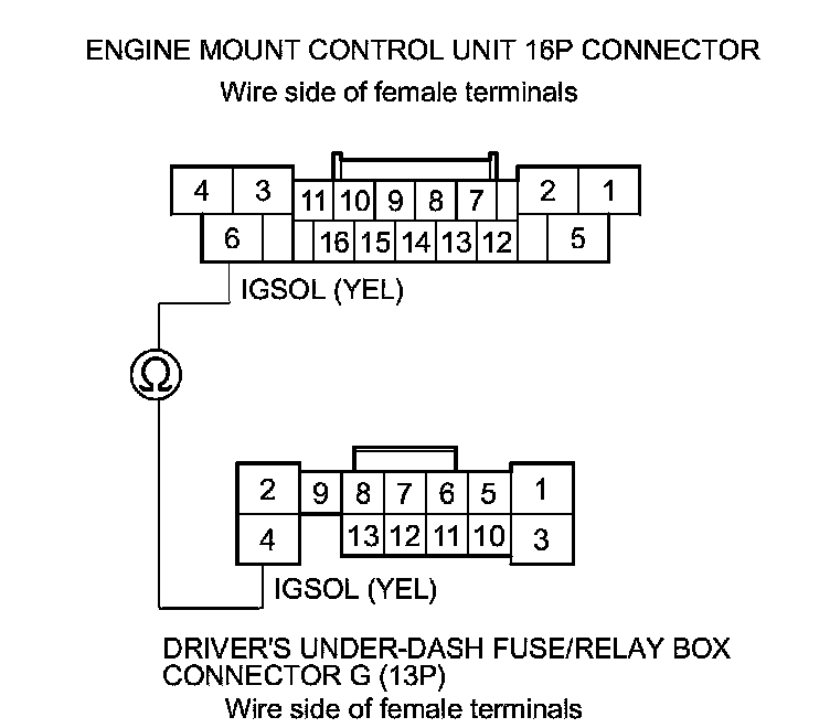 22. Check for continuity between engine mount control unit 16P connector terminal No. 6 and driver's under-dash fuse/relay box connector G (13P) terminal No. 4.