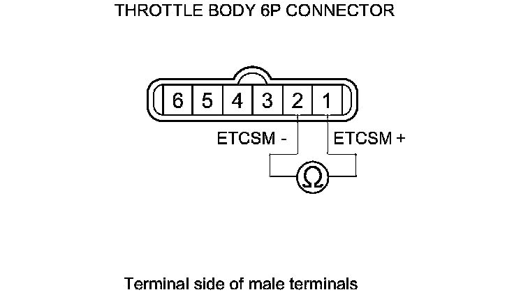 21. At the throttle body side, measure the resistance between throttle body 6P connector terminals No. 1 and No. 2 with the throttle fully closed.