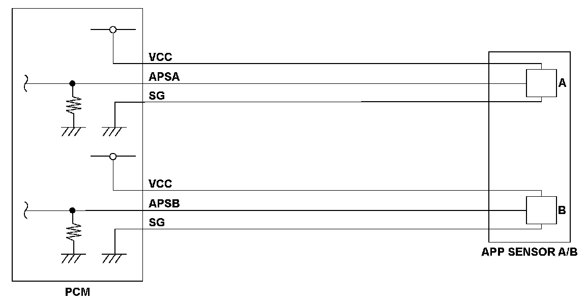 Accelerator pedal position (APP) sensor A is a part of the electronic throttle control system. It is used to convert the position of the accelerator pedal into electrical signals. Based on these signals, the powertrain control module (PCM) controls the throttle actuator so that the throttle position agrees with the accelerator pedal position. If the signal voltage from APP sensor A is a set value, the PCM detects a malfunction and stores a DTC.