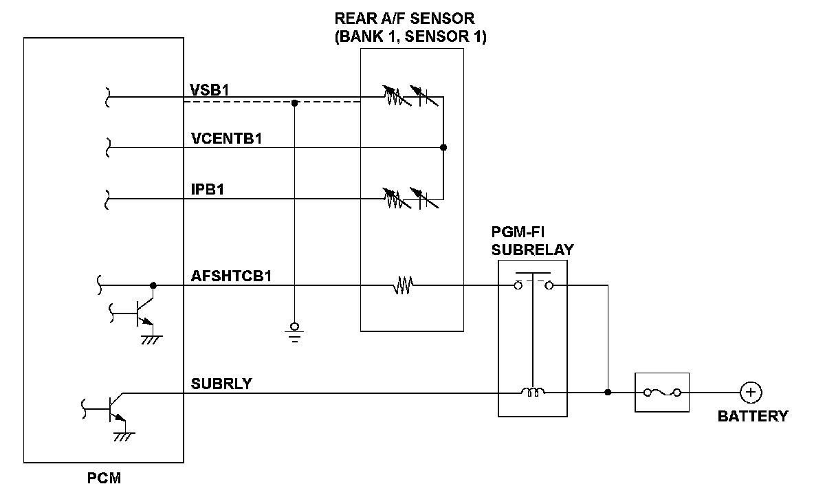 The rear air/fuel ratio (A/F) sensor (bank 1, sensor 1) is installed in the exhaust manifold and detects oxygen content in the exhaust gas. The rear A/F sensor transmits a signal to the powertrain control module (PCM), and it enables overall feedback control. The PCM controls fuel injection duration by comparing the target air/fuel ratio with the rear A/F sensor signal. If the IPB1 terminal voltage is out of a specified range, the PCM detects a malfunction and stores a DTC.
