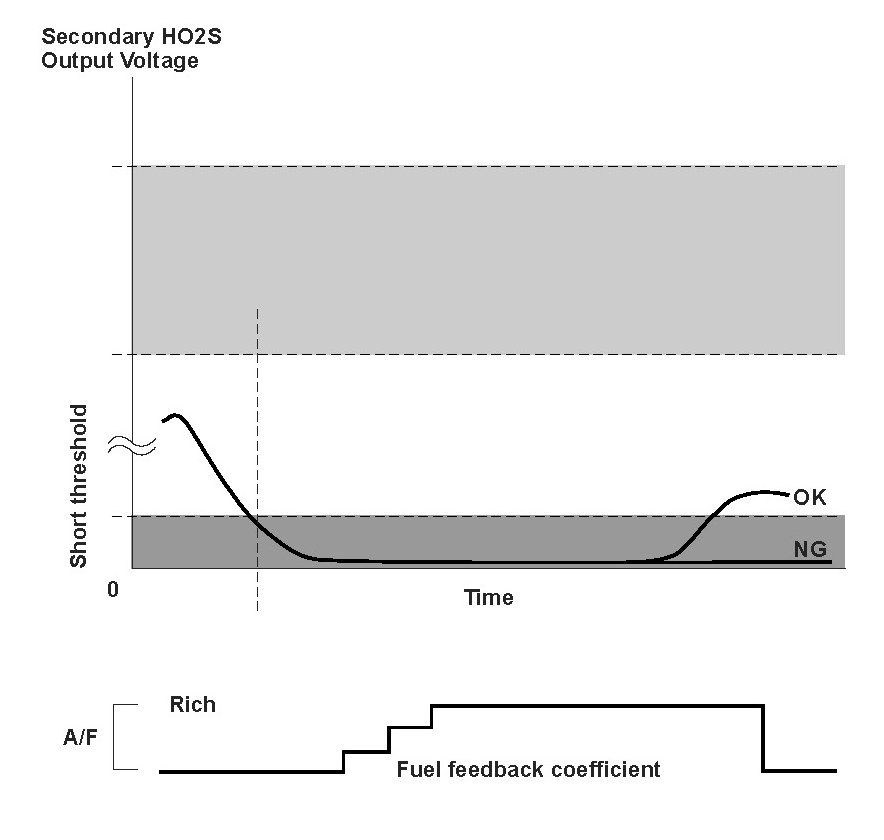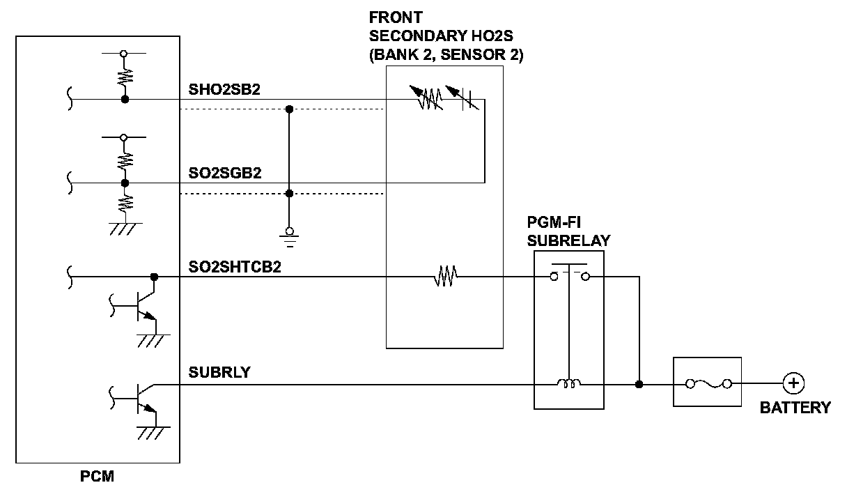The front secondary heated oxygen sensor (secondary HO2S (bank 2, sensor 2)) detects the oxygen content in the exhaust gas downstream of the front warm up three way catalytic converter (WU-TWC) (bank 2) during stoichiometric air/fuel ratio feedback control. The powertrain control module (PCM) controls the air/fuel ratio from the front air/fuel ratio (A/F) sensor (bank 2, sensor 1) output voltage so that the front WU-TWC efficiency is optimized. After current is applied to the front secondary HO2S heater, if the front secondary HO2S output continues to be low (lean) during feedback control, the PCM detects a malfunction and stores a DTC.
