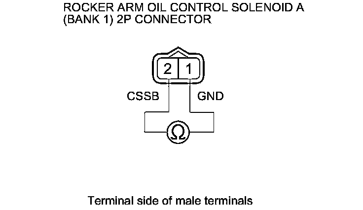 7. At solenoid side, measure the resistance between rocker arm oil control solenoid A (Bank 1) 2P connector terminals No. 1 and No. 2.