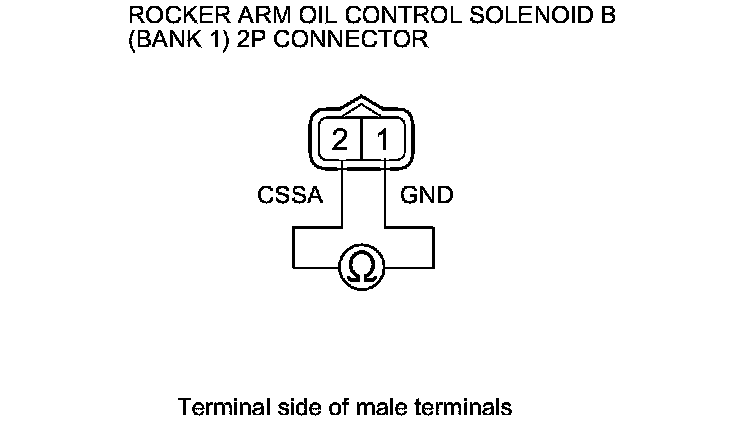 7. At the solenoid side, measure the resistance between rocker arm oil control solenoid B (Bank 1) 2P connector terminals No. 1 and No. 2.