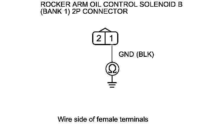 8. Check for continuity between rocker arm oil control solenoid B (Bank 1) 2P connector terminal No. 1 and body ground.