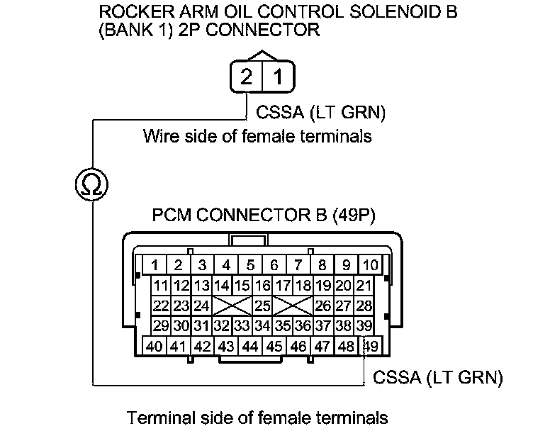 11. Check for continuity between PCM connector terminal B39 and rocker arm oil control solenoid B (Bank 1) 2P connector terminal No. 2.