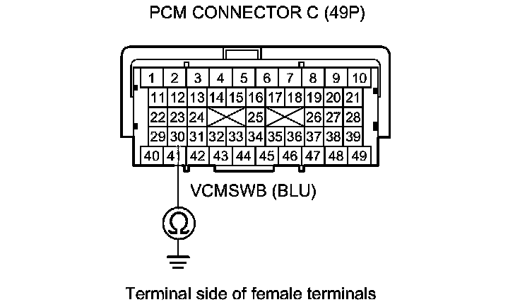 12. Check for continuity between PCM connector terminal C30 and body ground.
