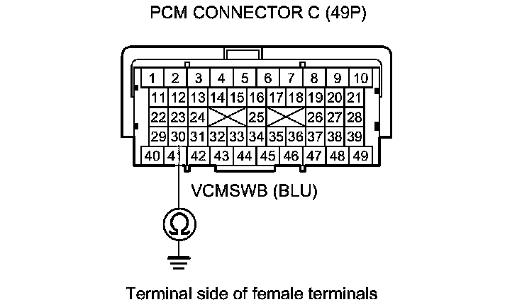 29. Check for continuity between PCM connector terminal C30 and body ground.