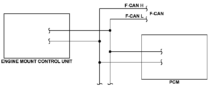 The controller area network (CAN) transmits/receives pulsing signals to/from the control modules simultaneously by using two signal lines (F-CAN H and F-CAN L). When the information is not sent from the powertrain control module (PCM) through the F-CAN and this condition continues for a specified time or when the information sent from the PCM is abnormal and this condition continues for a specified cycle, the engine mount control unit detects a malfunction and stores a DTC.