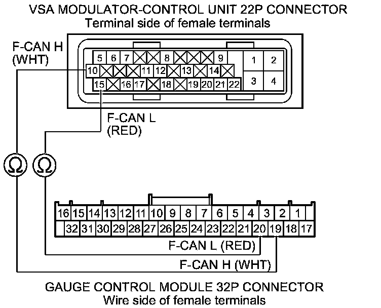 9. Check for continuity between gauge control module 32P connector terminals No. 19 and No. 20 and VSA modulator-control unit 22P connector terminals No. 10 and No. 15 respectively.