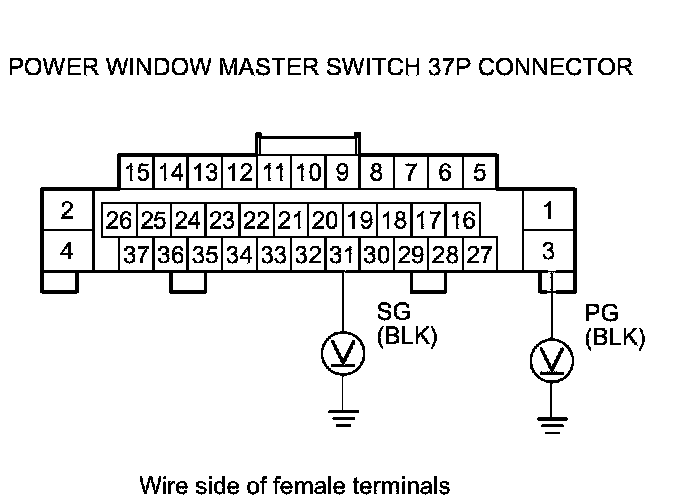 9. Measure the voltage between body ground and power window master switch 37P connector terminal No. 3 and No. 31 individually.