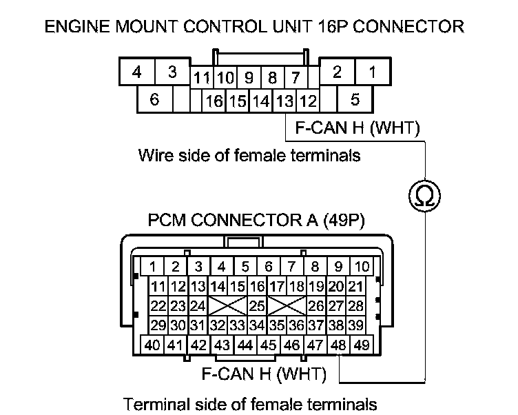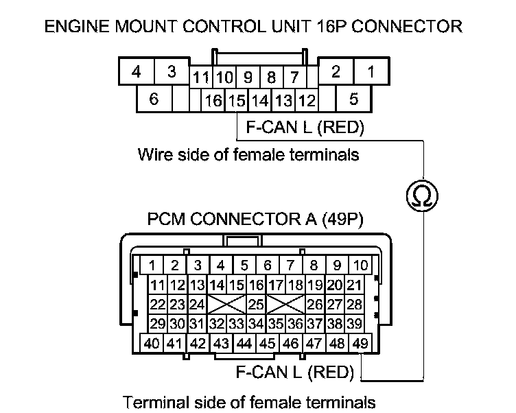 10. Check for continuity between PCM connector terminal A49 and engine mount control unit 16P connector terminal No. 15.