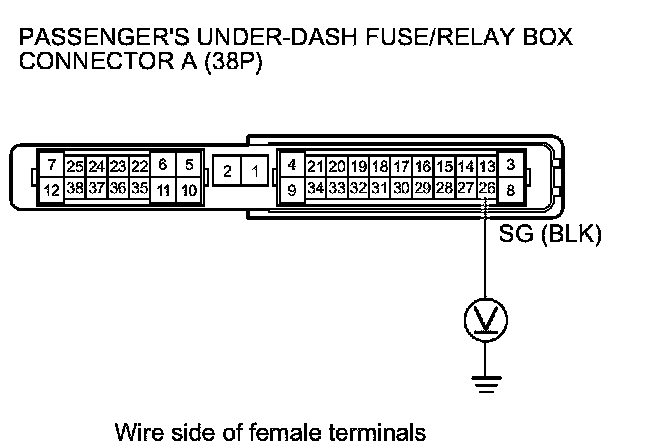 6. Measure the voltage between body ground and passenger's under-dash fuse/relay box connector A (38P) terminals No. 18 and No. 28 individually.