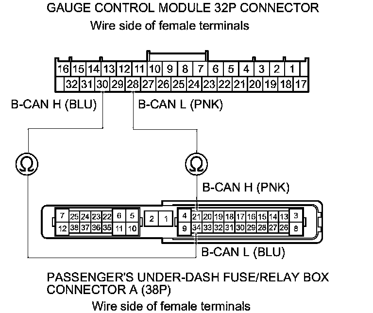 13. Check for continuity between gauge control module 32P connector terminals No. 28 and No. 30 and passenger's under-dash fuse/relay box connector A (38P) terminals No. 21 and No. 34 respectively.