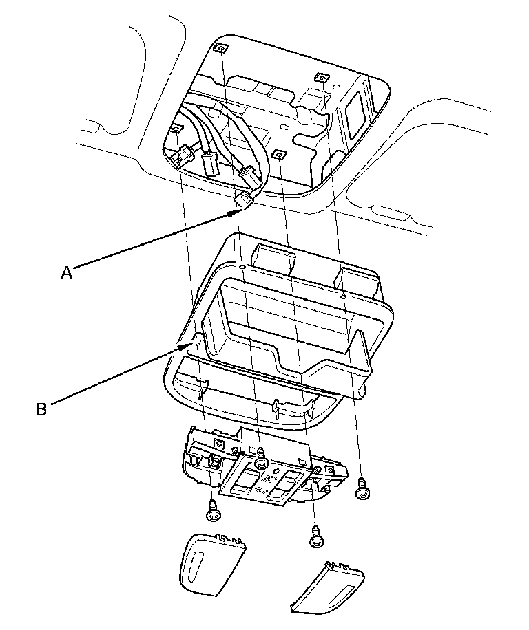 2. Remove the roof console, and disconnect the 5P connector (A) from the HomeLink unit (B).