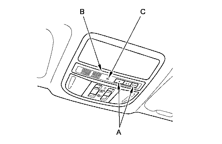 7. Press and hold the test transmitter button and one of the HomeLink unit buttons (C) at the same time.