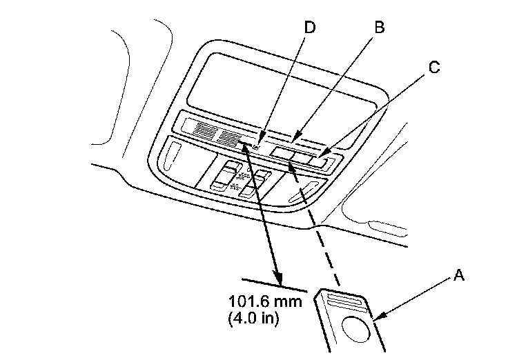 6. Point the test remote transmitter (A) straight up exactly 101.6 mm (4.0 in) away from the HomeLink unit (B).