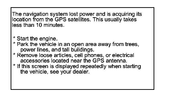 It this screen appears, turn off the engine, then restart the vehicle and move it to a different location. If the disclaimer screen appears, the GPS initialization is complete.