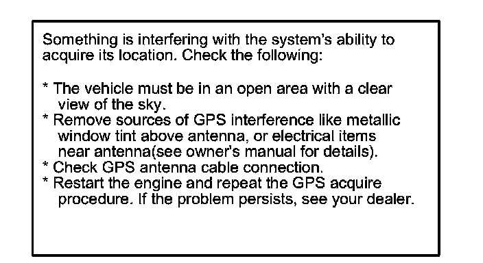 - If the system is still unable to acquire a signal, follow the instructions on the screen. If this screen appears again, go to GPS icon is white or not shown troubleshooting Symptom Troubleshooting.