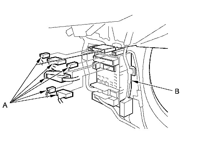 2. Disconnect the connectors (A) from the passenger's under-dash fuse/relay box (B).