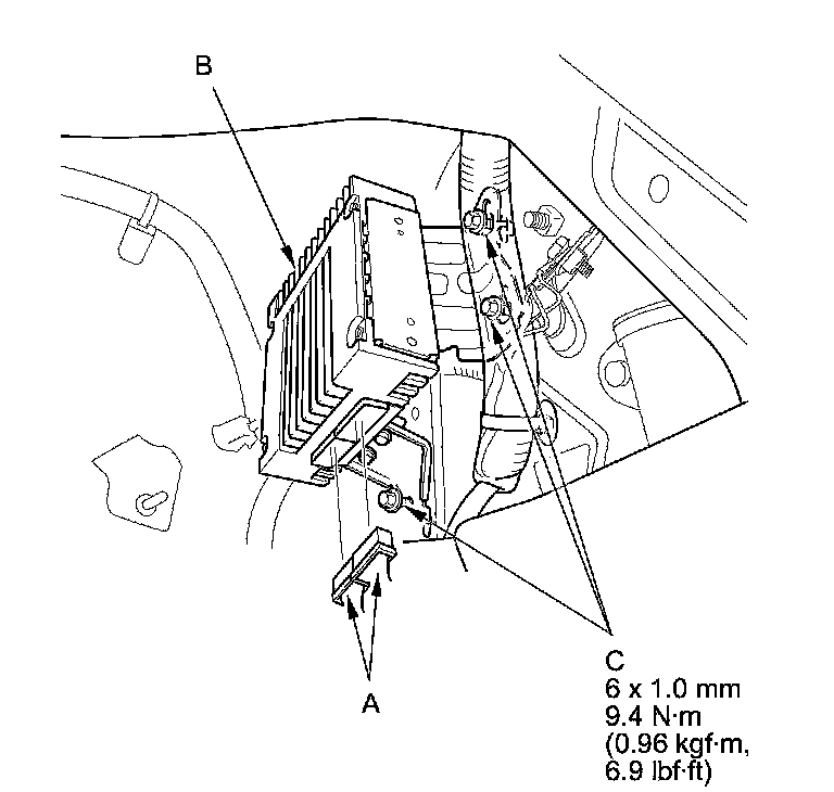 3. Disconnect the connectors (A) from the stereo amplifier (B), then loosen the bolts (C).