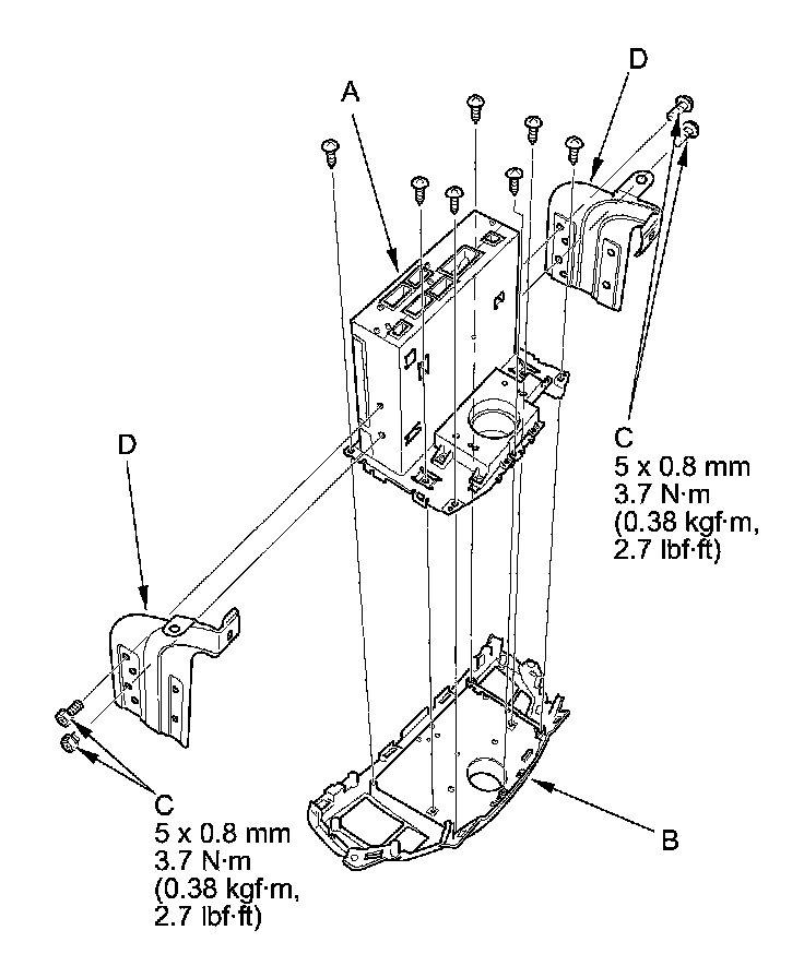 5. Remove the bolts (C) and brackets (D) from the audio unit.