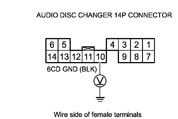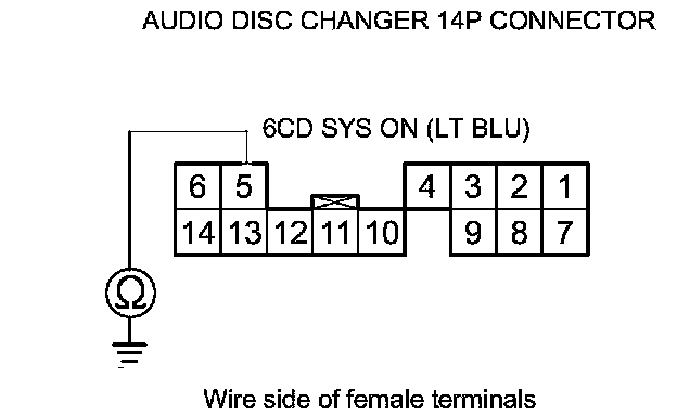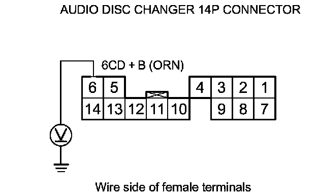 5. Measure the voltage between audio disc changer 14P connector terminal No. 6 and body ground.