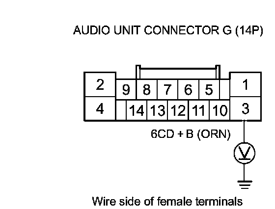 6. Measure the voltage between audio unit connector G (14P) terminal No. 3 and body ground.